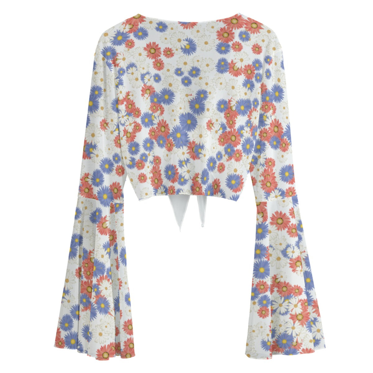Kawaii Heaven Women's Bell Sleeve Crop Blouse with Front Tie - Colorful Daisy Print
