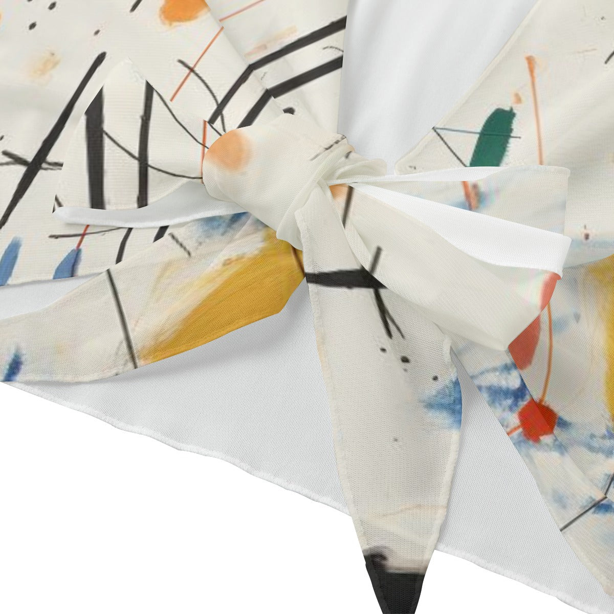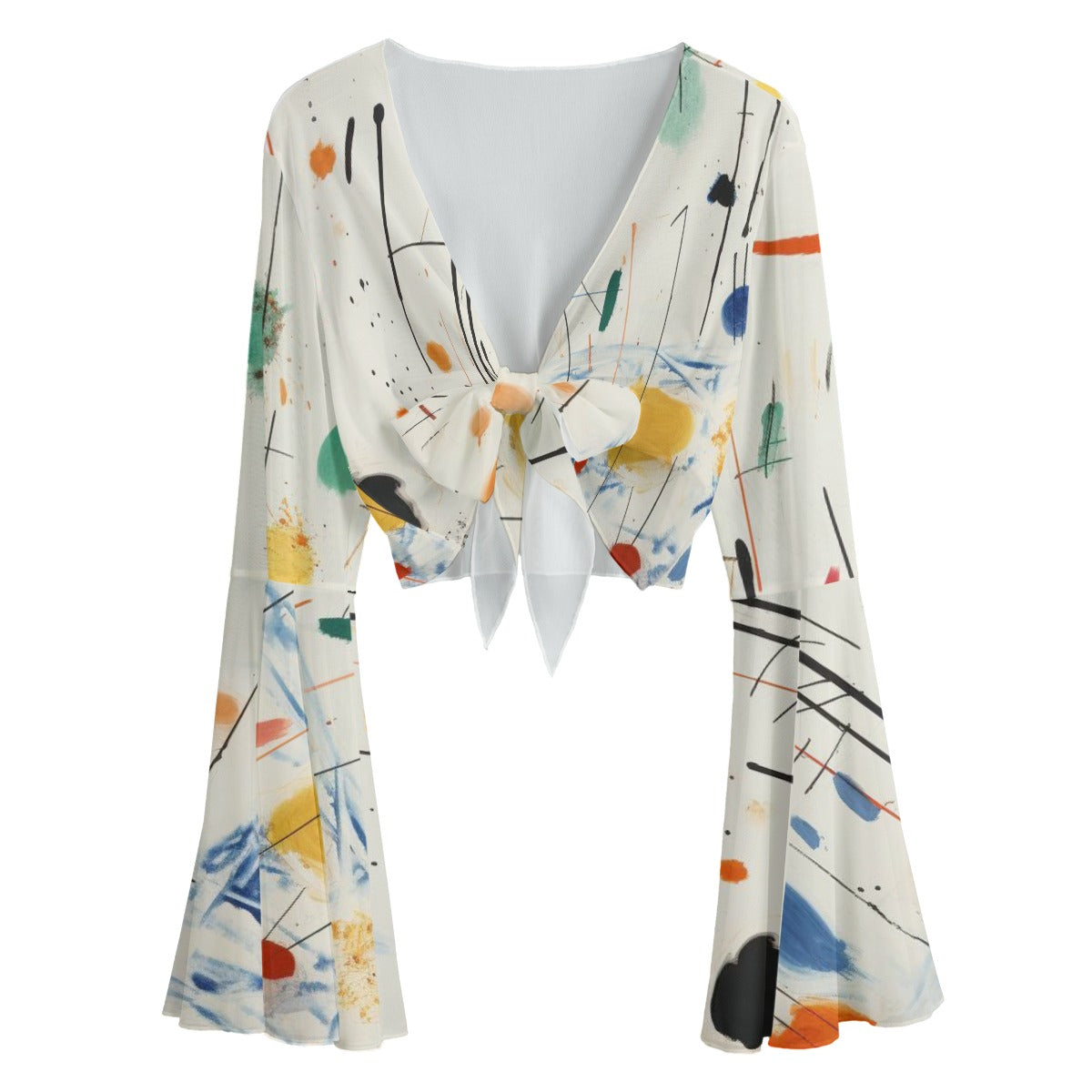 Add artistic flair to your wardrobe with this tie front bell sleeve blouse. Designed with a vibrant abstract print and soft mesh fabric, it’s the perfect blend of comfort and creativity. The flowing bell sleeves and front knot give it a flattering, feminine silhouette.