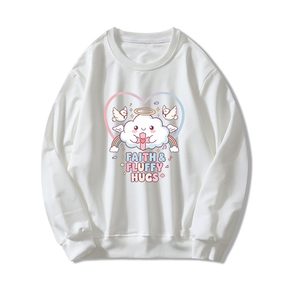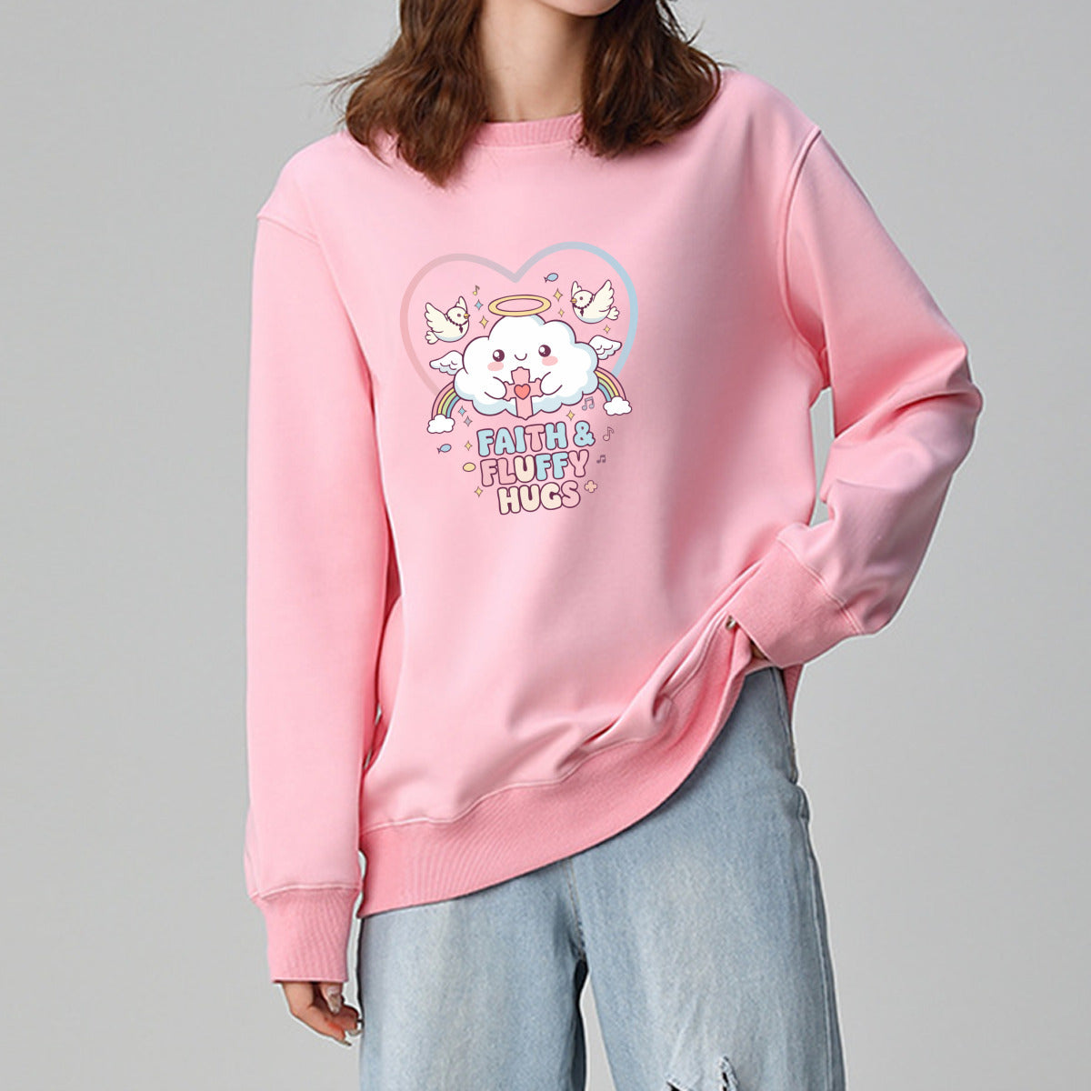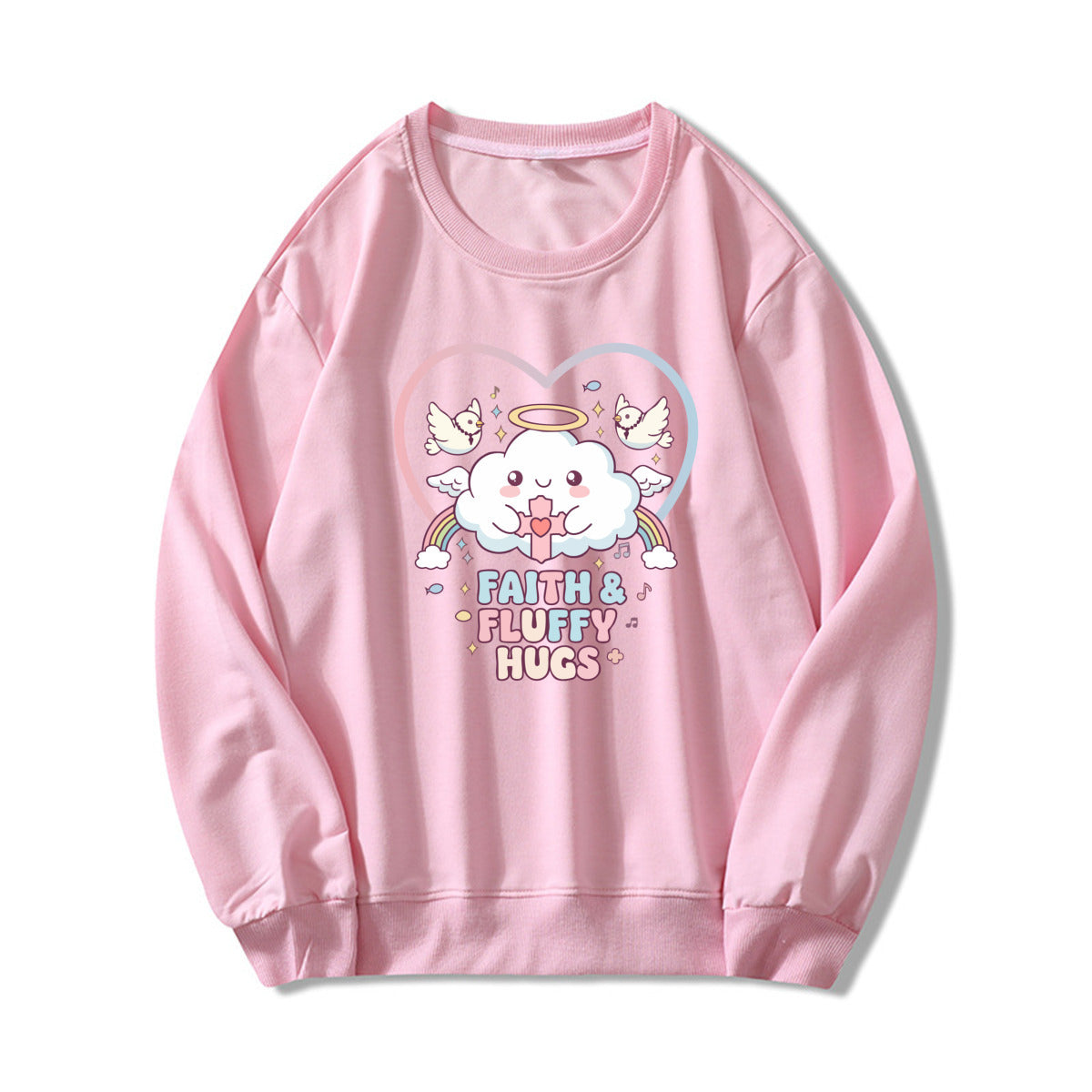 Bring softness and positivity to your day with this pastel pink Faith & Fluffy Hugs sweatshirt. The adorable angel cloud and dove print give it a heartwarming kawaii touch, perfect for cozy days and casual outfits.
