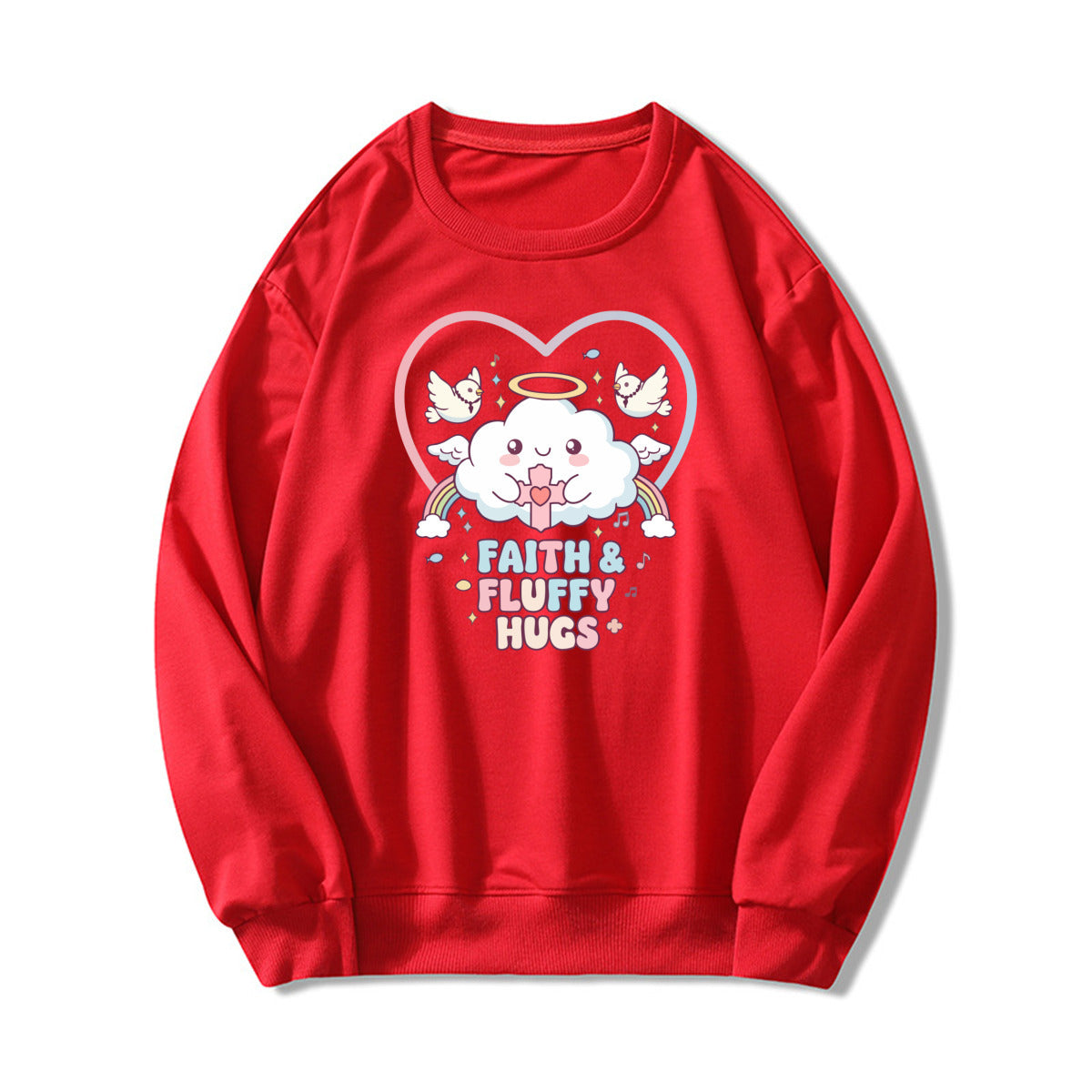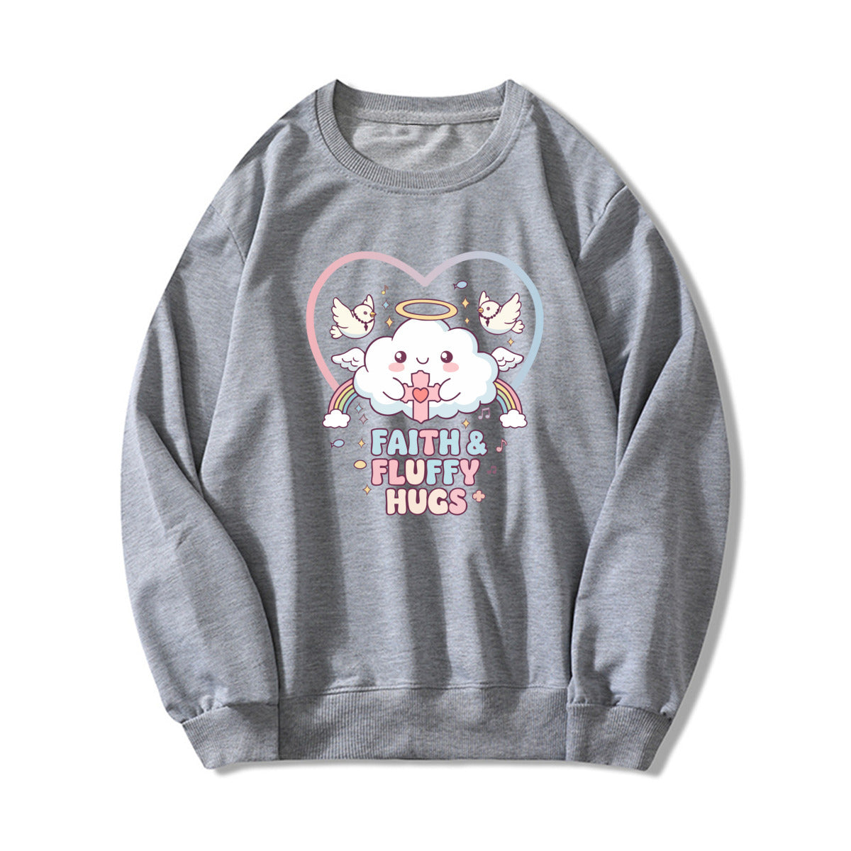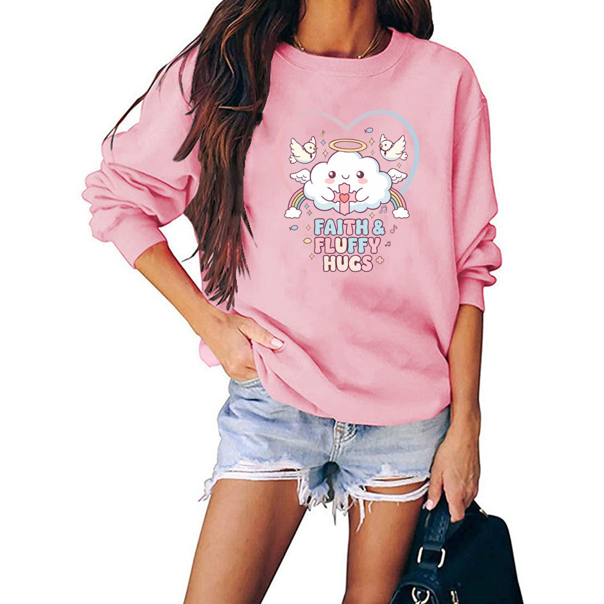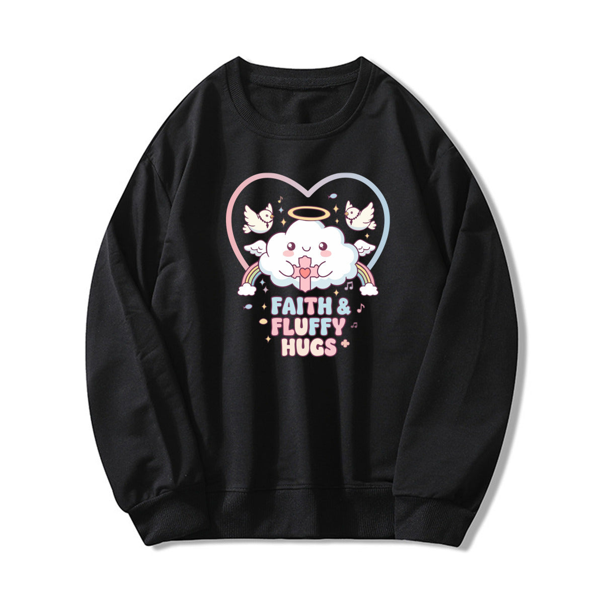 Bring softness and positivity to your day with this pastel pink Faith & Fluffy Hugs sweatshirt. The adorable angel cloud and dove print give it a heartwarming kawaii touch, perfect for cozy days and casual outfits.