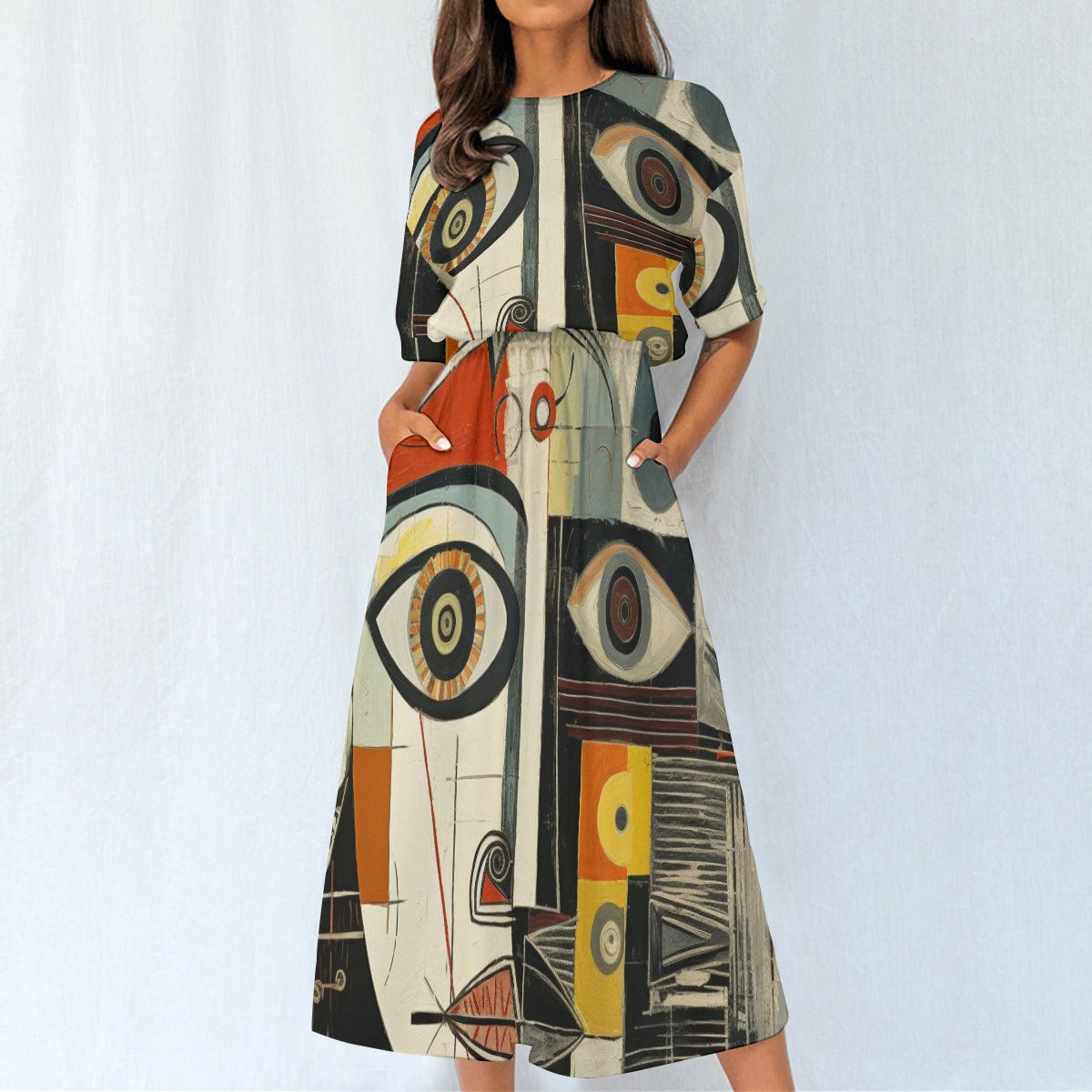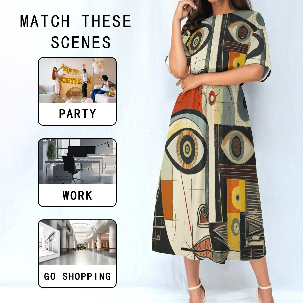 Abstract Art Midi Dress – Women’s Elastic Waist Casual Fashion