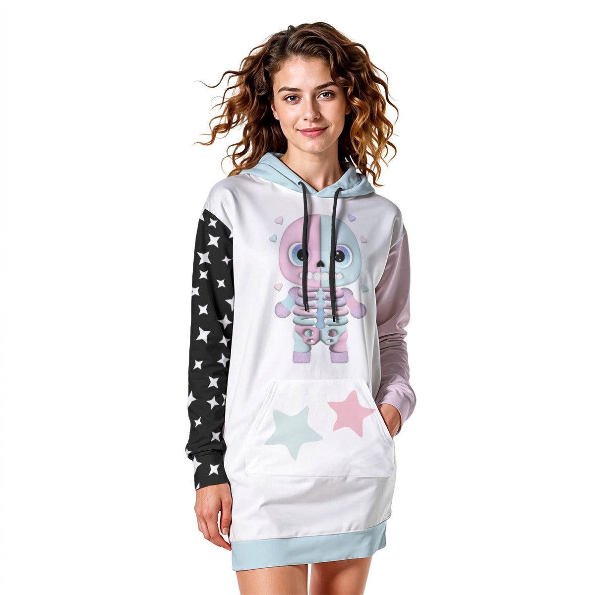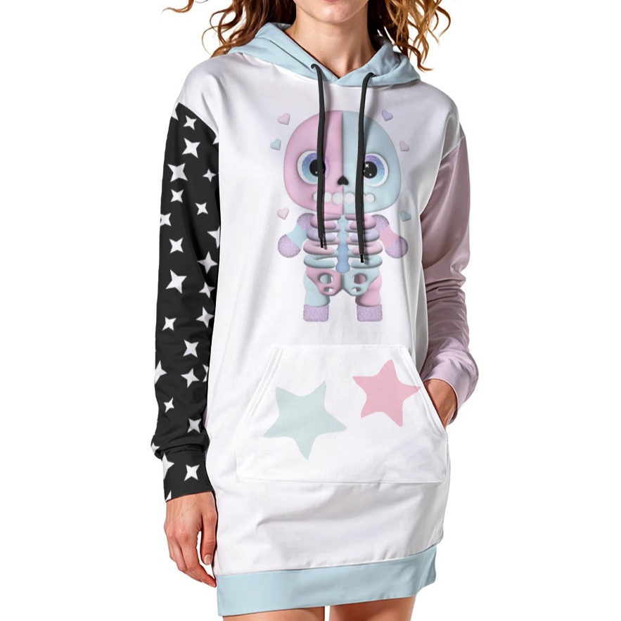 Kawaii Heaven Women's Heavy Fleece Long Hoodie with Pastel Skeleton & Star Print
