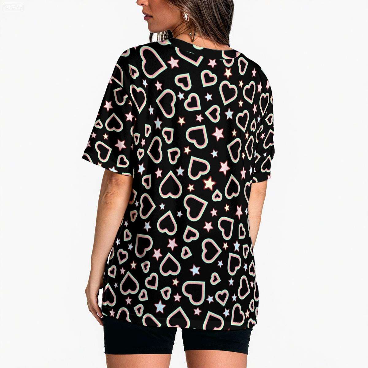 Bring playful energy to your wardrobe with this black T-shirt featuring a stylish heart and star pattern. Designed with a relaxed fit and soft, breathable fabric, it’s the perfect everyday piece for comfort and style. Pair it easily with jeans, leggings, or skirts for a casual yet trendy look.