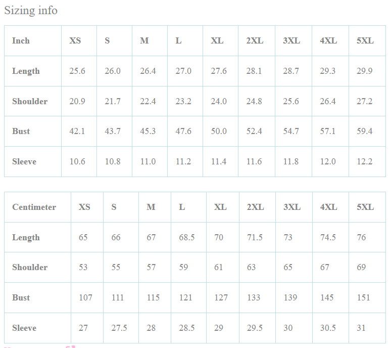 | Centimeter | XS | S | M | L | XL | 2XL | 3XL | 4XL | 5XL |