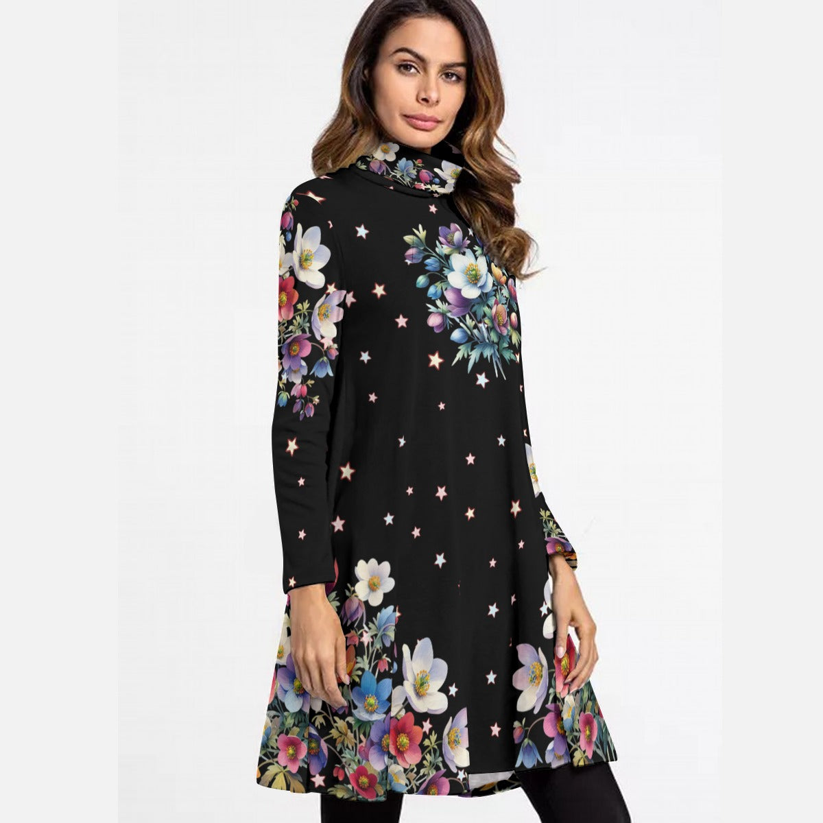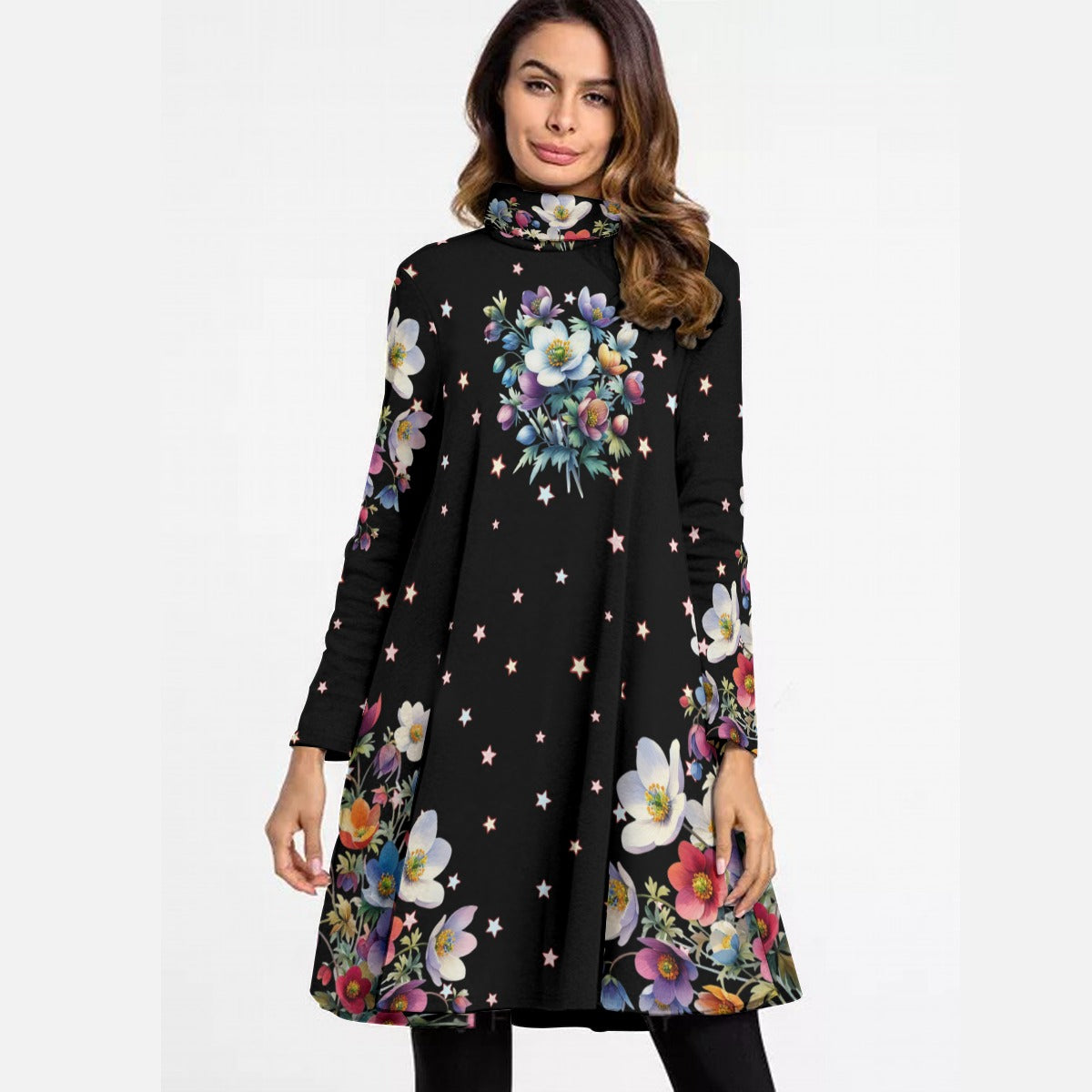 Made from soft, breathable microfiber, it drapes comfortably while keeping you warm on cooler days. The relaxed A-line silhouette flows naturally, and the turtleneck adds a touch of seasonal style. Finished with long sleeves and a vibrant all-over floral pattern, this dress works effortlessly for everyday wear, office looks, or casual outings.