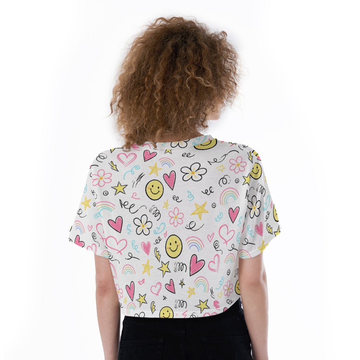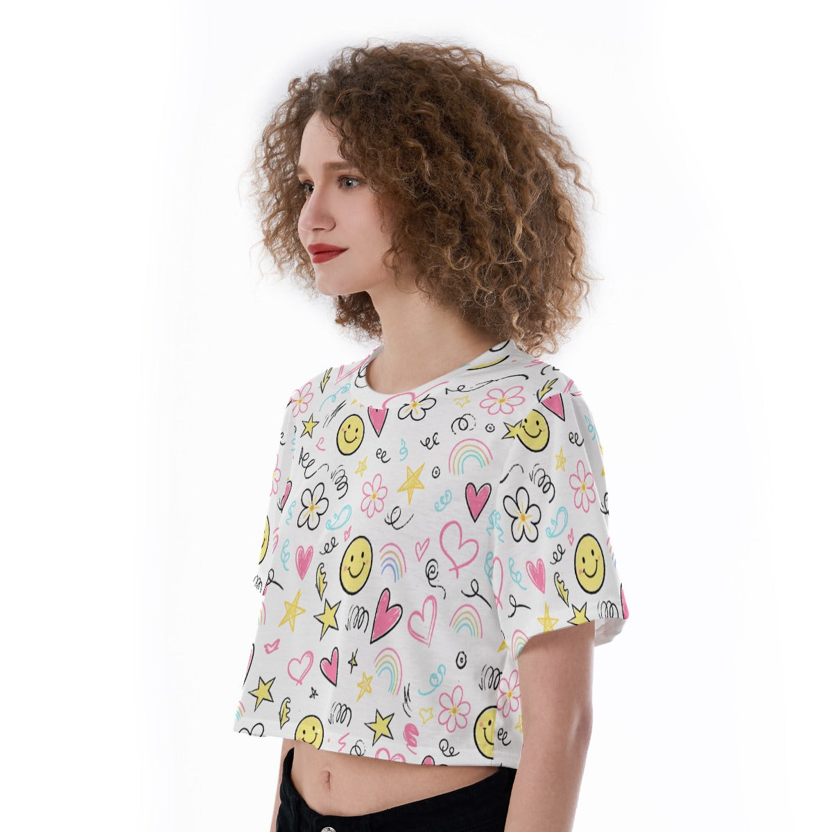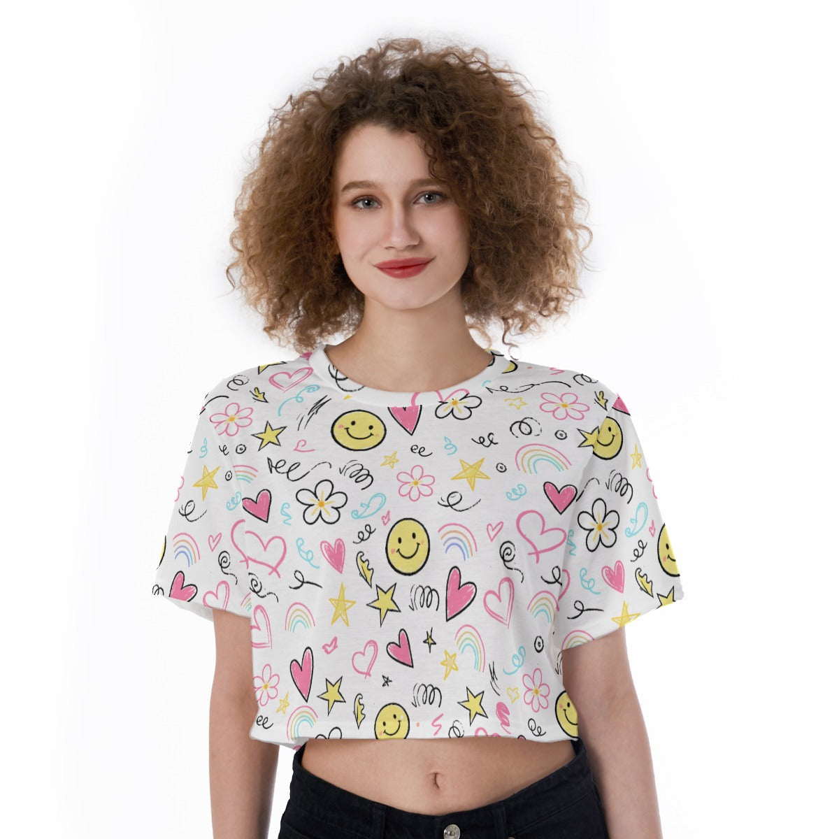 Bring fun and personality into your outfit with this kawaii smiley face crop top. Featuring a vibrant mix of doodles, hearts, stars, flowers, and smiley faces, this cropped T-shirt adds a playful Y2K-inspired touch to your everyday style.