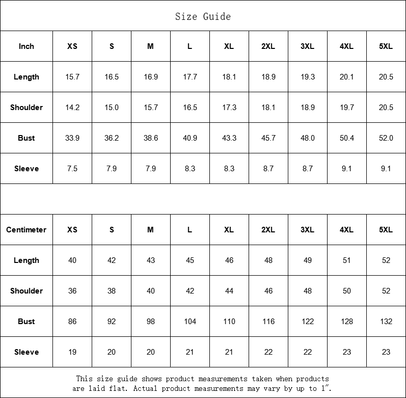 | Inch | XS | S | M | L | XL | 2XL | 3XL | 4XL | 5XL |