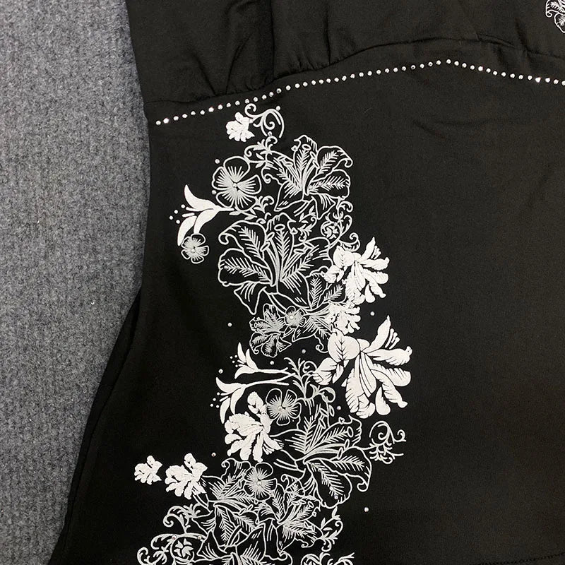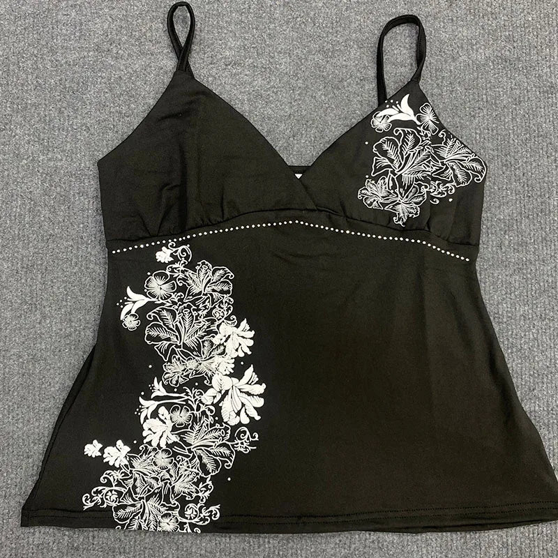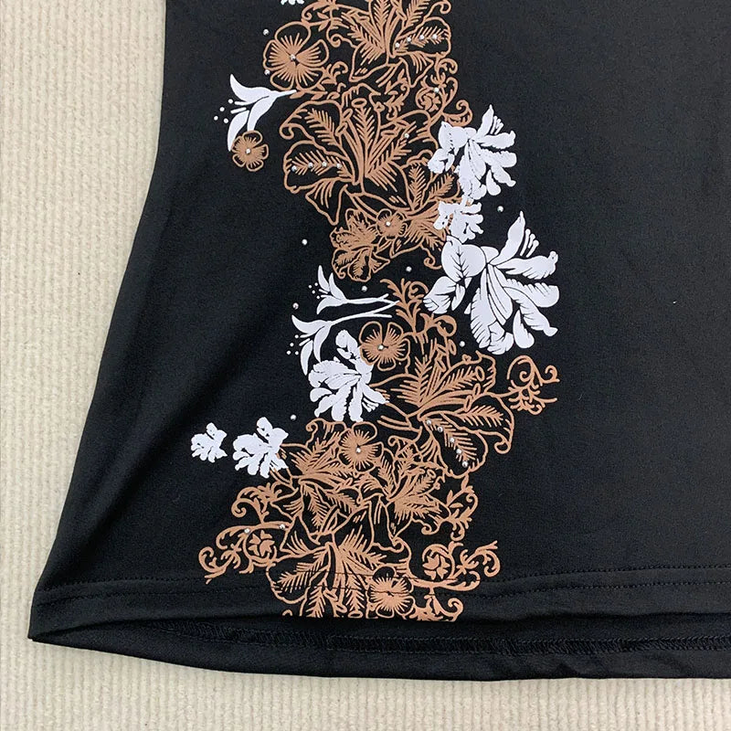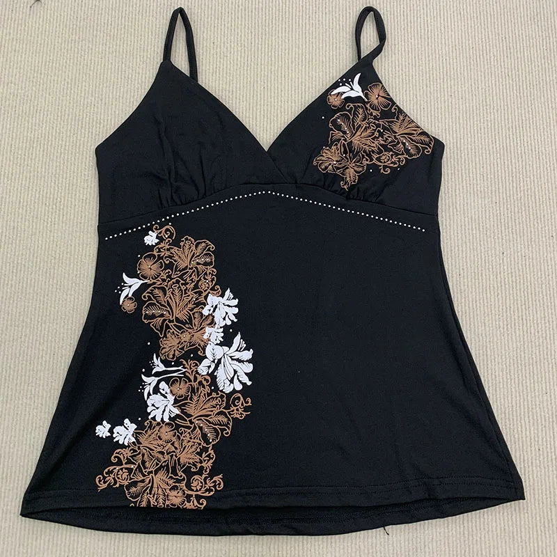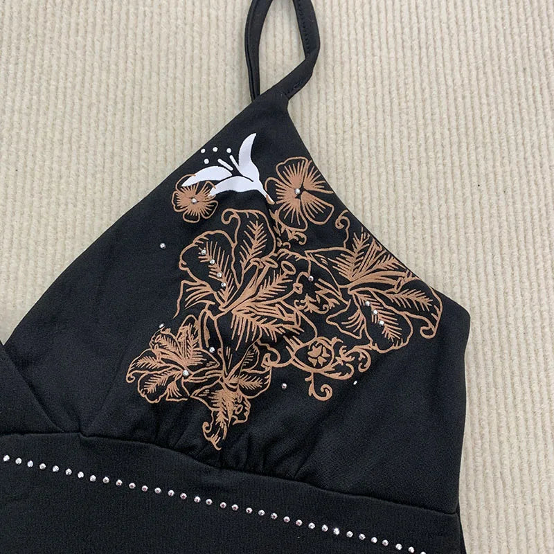 Harajuku Flower Print Tank Top – Women’s Gothic Rhinestone Cami | Vintage Black Off-Shoulder Summer Vest