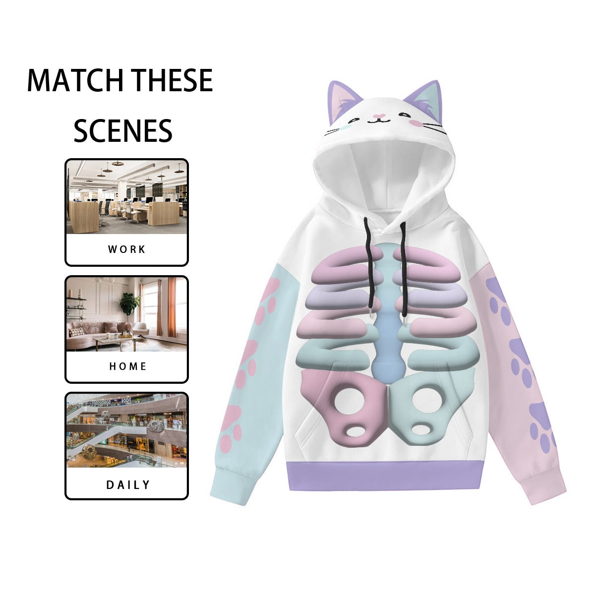 Kawaii Heaven Women's Cat Ear Hoodie with Pastel Skeleton Print