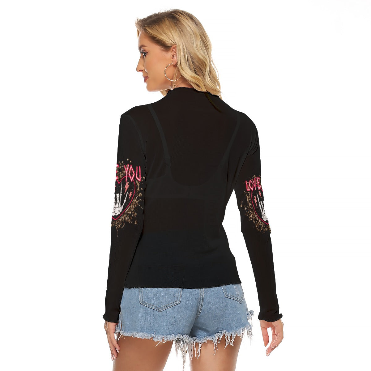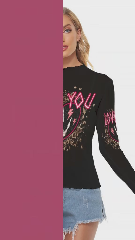 This gothic mesh long sleeve top delivers a bold statement with its striking “Love You” graphic and edgy hand-and-heart artwork. The sheer mesh fabric keeps the look light and breathable, while the slim silhouette creates a confident, modern fit.