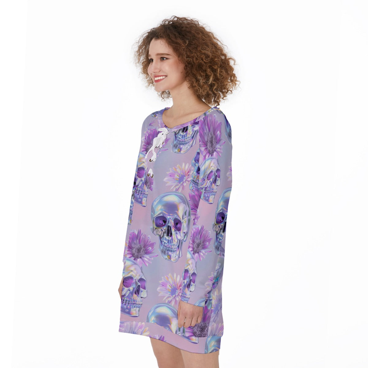 Designed with long sleeves and a comfortable drape, this piece can be worn as an oversized top or styled like a sweatshirt dress. Pair it with boots, leggings, or layered accessories for a modern gothic-inspired outfit.