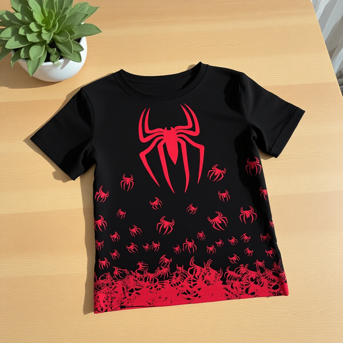 Make a bold statement with this striking red spider graphic T-shirt. Designed with a dramatic spider print on a deep black background, this edgy tee blends gothic aesthetics with modern streetwear style.