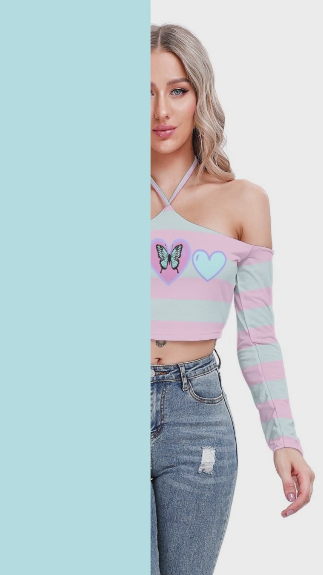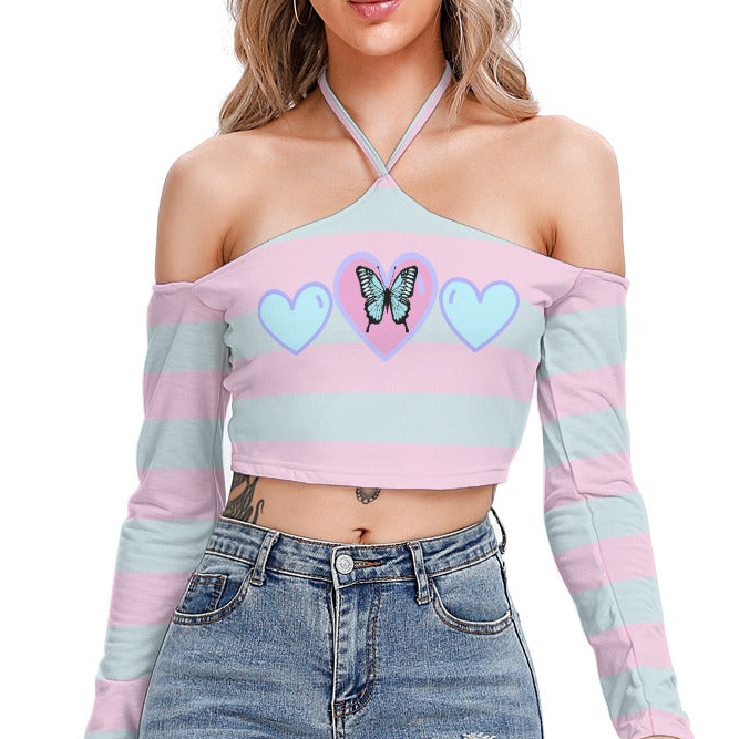 This cropped top features a playful butterfly and heart design paired with soft pastel stripes for a fresh, eye-catching look. The off-shoulder neckline combined with a halter neck strap highlights the shoulders, while the long sleeves balance the silhouette with a sleek, modern feel.