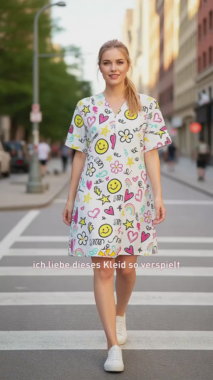 Add a playful touch to your wardrobe with this kawaii smiley face tunic dress, designed to bring fun, color, and personality to your everyday outfits. Featuring a vibrant mix of smiley faces, hearts, stars, and doodle-style graphics, this dress stands out with its cheerful and trendy look.