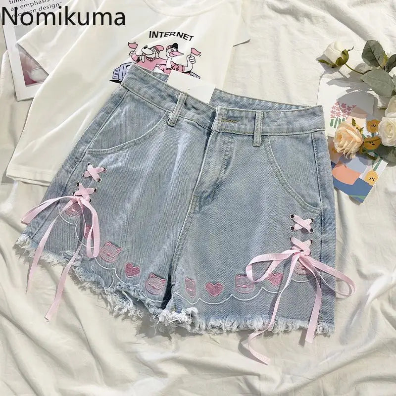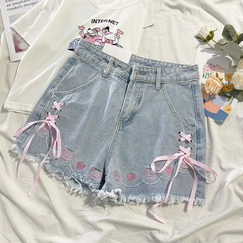 Japanese Denim Shorts for Women – High Waist Embroidered Bandage Shorts | Cute 2025 Fashion Bottoms